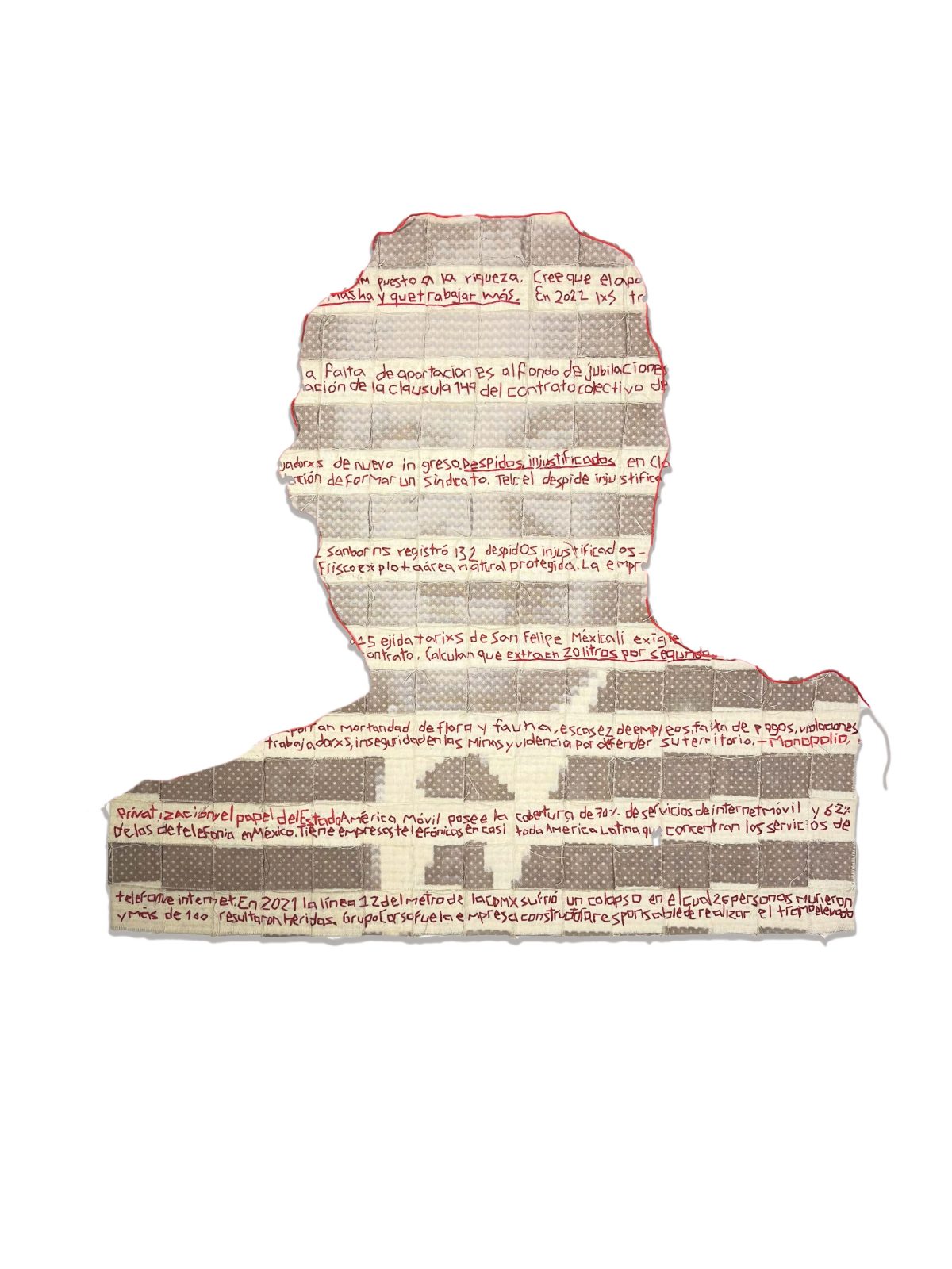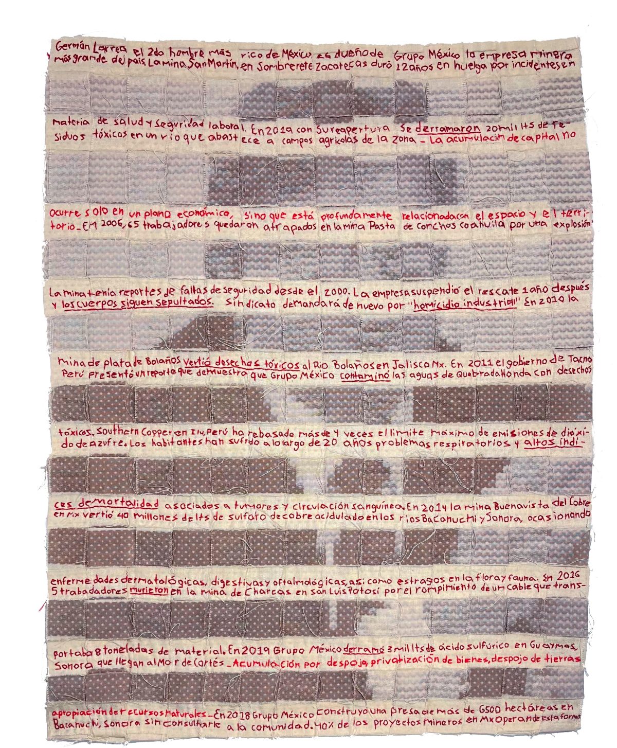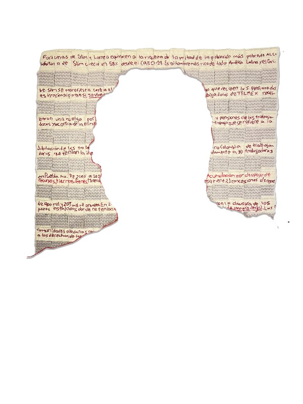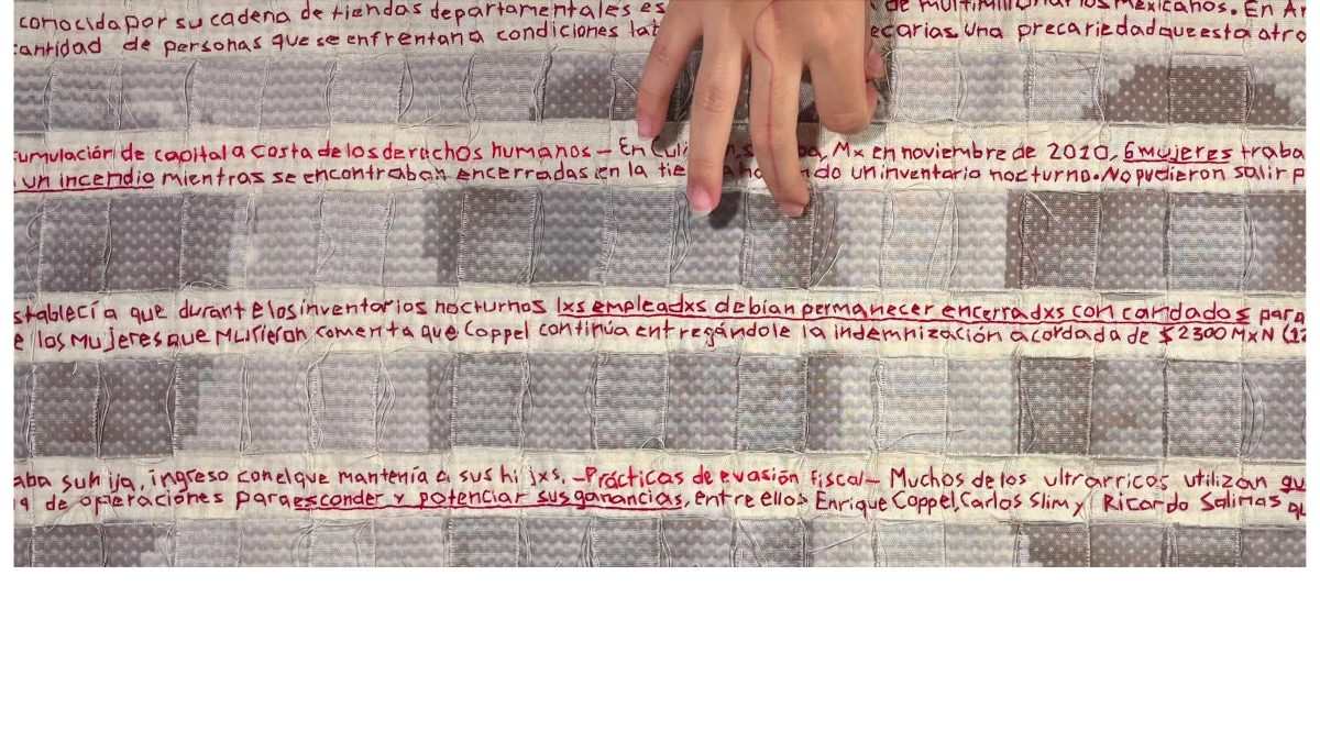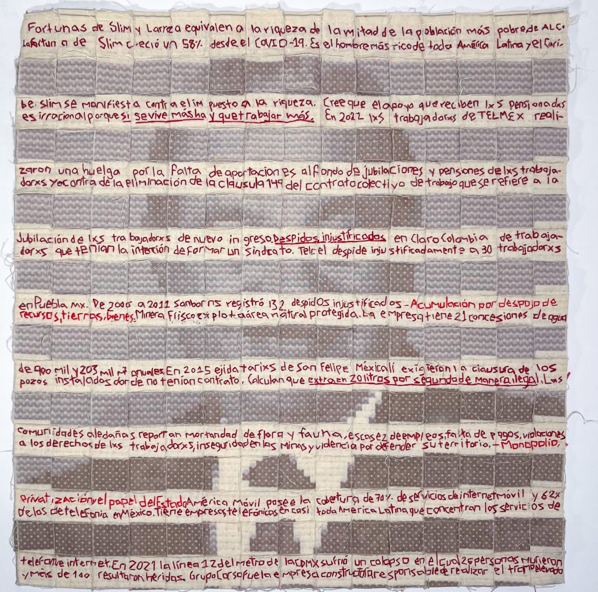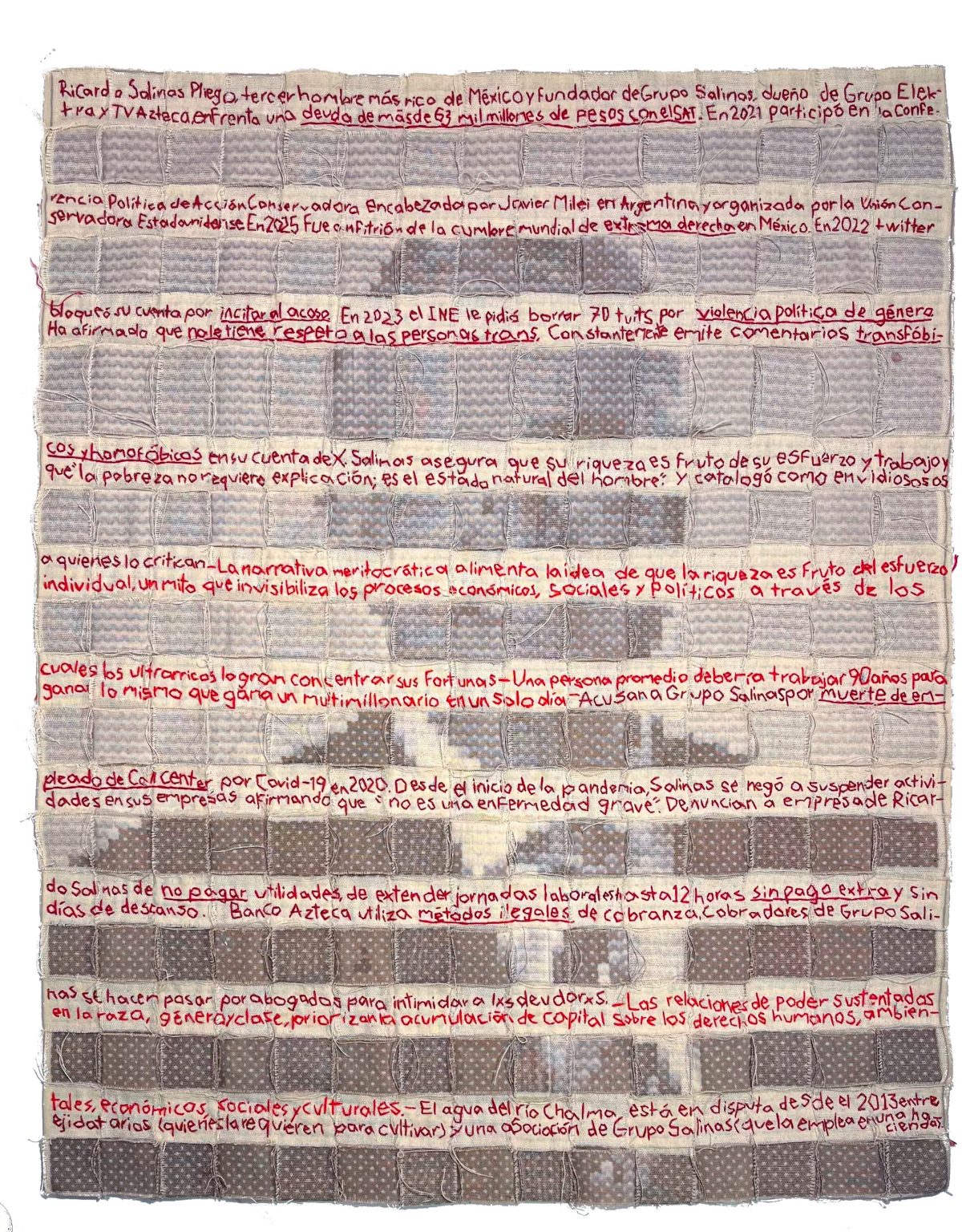 “Entre la imagen y la realidad: Hilos de poder e injusticia”, es una obra visual que busca visibilizar las conexiones entre las élites económicas, sus prácticas de acumulación de capital, y su impacto directo en las vidas de las personas de Latinoamérica. Se trata de cuatro piezas con los rostros de cuatro empresarios claves y categorizados como los más ricos de México, develando a través de la imagen como su exagerada acumulación de riqueza y sus acciones siguen perpetuando las desigualdades.