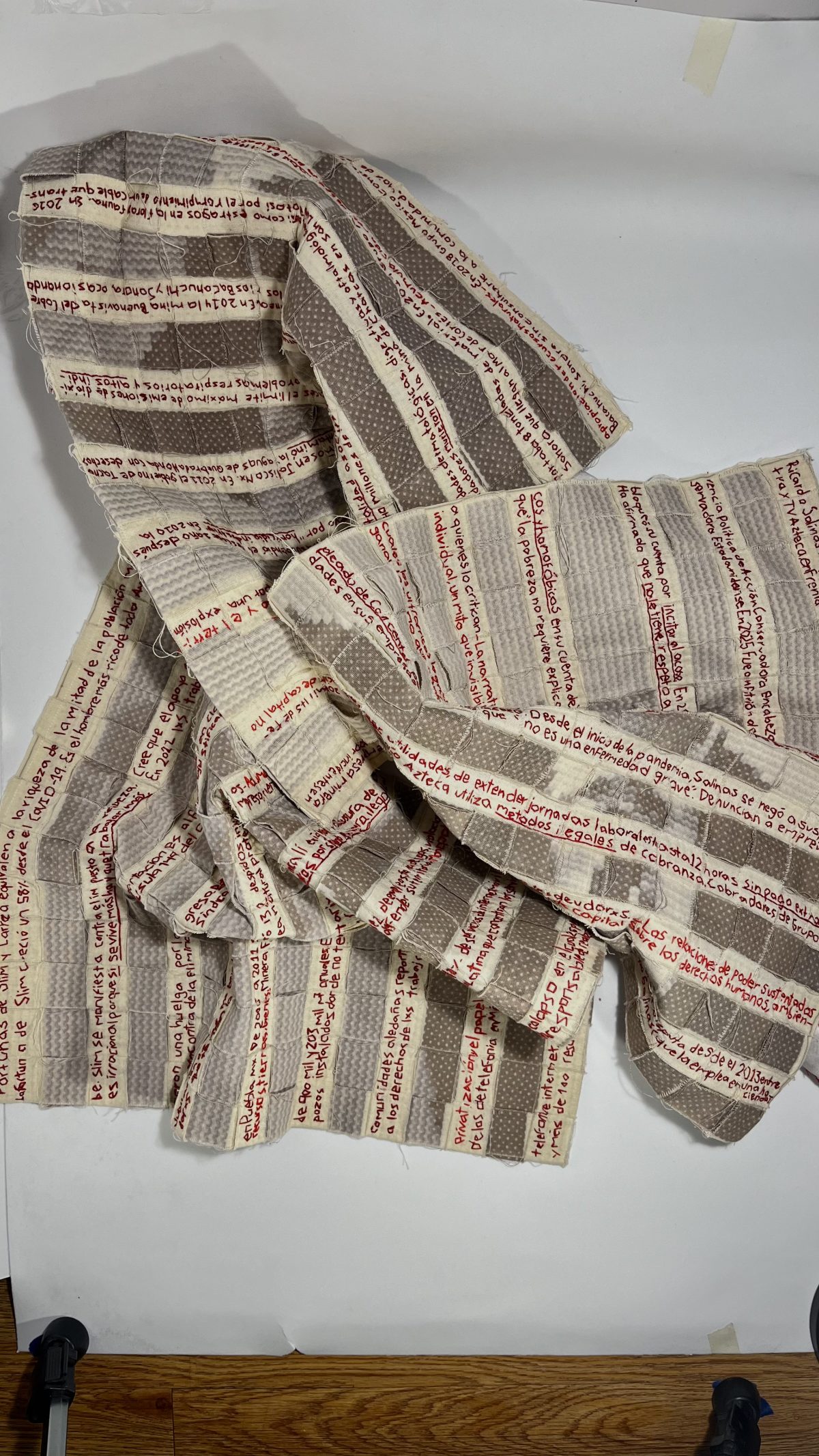 Socióloga y profesora adjunta de la UNAM y artista textil autodidacta y experimental. Ella desde su arte aborda y explora temas como los cuerpos, la violencia, el género y la experiencia de amor sáfico.